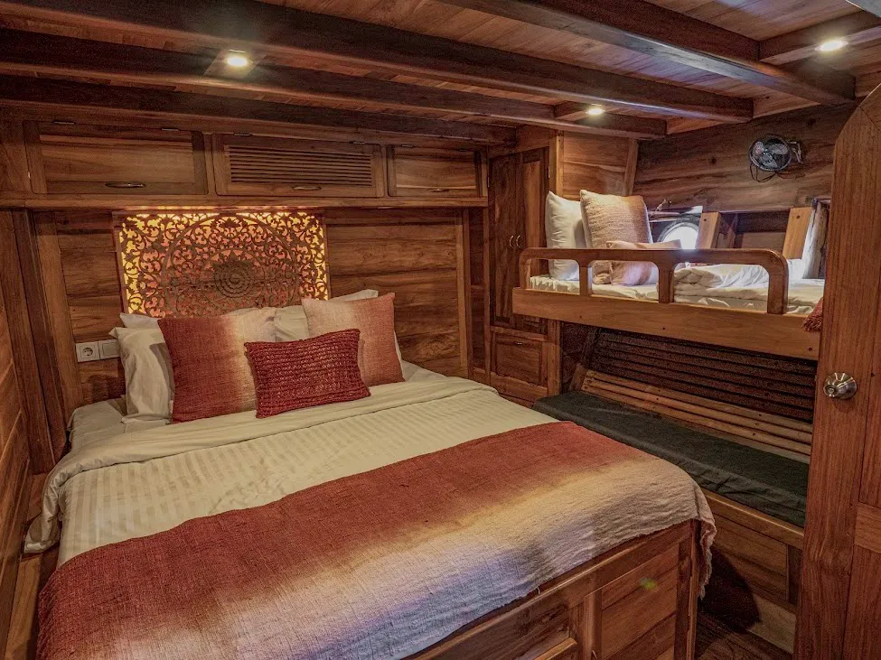 The single cabin layout changes everything. You’re not sharing space, not even socially if you don’t want to. Meals appear on the upper deck at your chosen time—breakfast of banana pancakes with palm sugar, served as we drifted between Kanawa and Nusa Kode. The crew anticipated needs without hovering: a cold towel after the dragon walk on Komodo Island, a spare snorkel mask already rinsed and waiting by the dive bench. They knew the current at Manta Point would shift at 10:42, and they timed our arrival to the minute.
